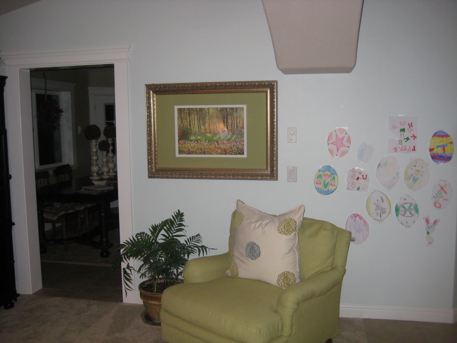 And did I already tell you that I added that grosgrain ribbon to my drapes? It’s definitely a super modern touch, but I like it. I also added a bit more of my attempted artwork. Oooohh, and I got some scrapbook paper at a yard sale that will make for some fabulous holiday artwork come Christmastime….