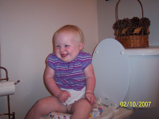 Jane officially went potty and poopoo in the toilet last night! For the last couple weeks, she has been letting us know when she has to go poopoo by pointing to her bum and saying “uh paw-ee.” So we have practiced putting her on the toilet several times, but until last night, nothing had ever happened. Last night, she and Camp were taking a bath and Jane started doing the point-at-her-bum thing, so I took her out and let her sit on the toilet for a while. She didn’t go at first, so I held her for a little while without her diaper, and then when I coud tell that she wasn’t going to hold it much longer, I put her back on the toilet and started reading her books. After about ten minutes, I took her off the toilet only to discover that she had gone potty and poopoo without me even realizing it! Yay, Janey!