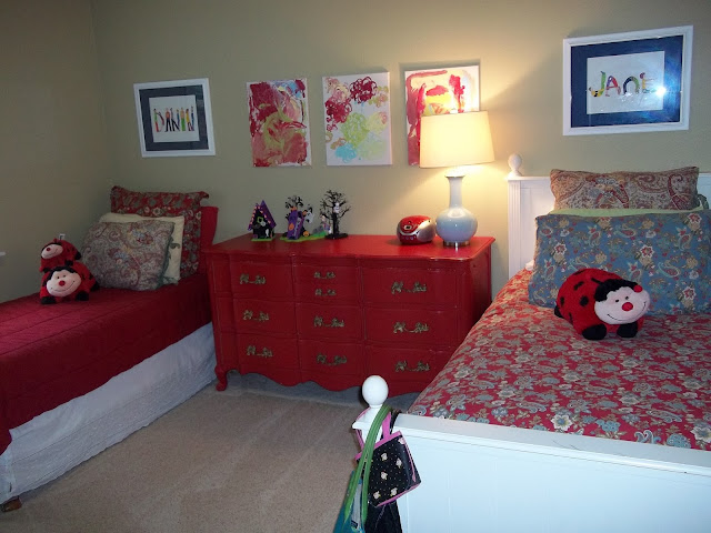 Janey’s and Danin’s room has only been three colors, but only because painting it became much harder once we put in the trim treatment on the walls–which I’ve loved.   It’s in there that I removed the closet doors in order to accommodate the “school room” that Janey created in her closet.  It’s from that window that the girls have continuously climbed–out onto the blue water barrels and into the backyard– to escape from quiet time.  It’s in there that Danin scratched letters and artwork onto her dresser and peeled paint from the trim on the wall by her bed (that little devil!), and it’s in there that many a piece of candy was smashed into the carpet.    It’s also been in that room that Janey and Danin have spent countess hours (supposed to be spent sleeping) playing and laughing and making humongous messes.    I can hear them in there right now (at 10:37 P.M.) as I type.